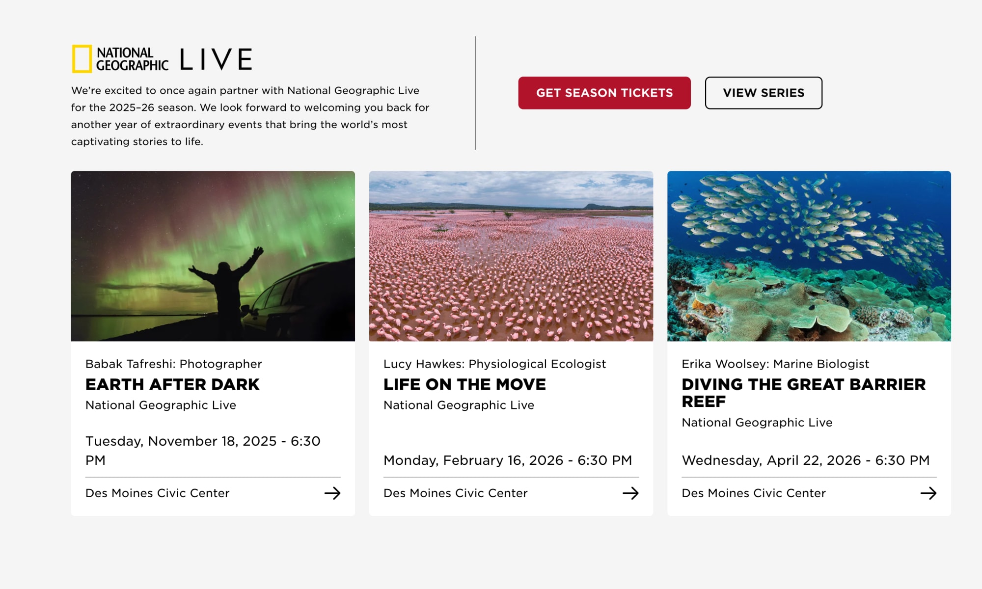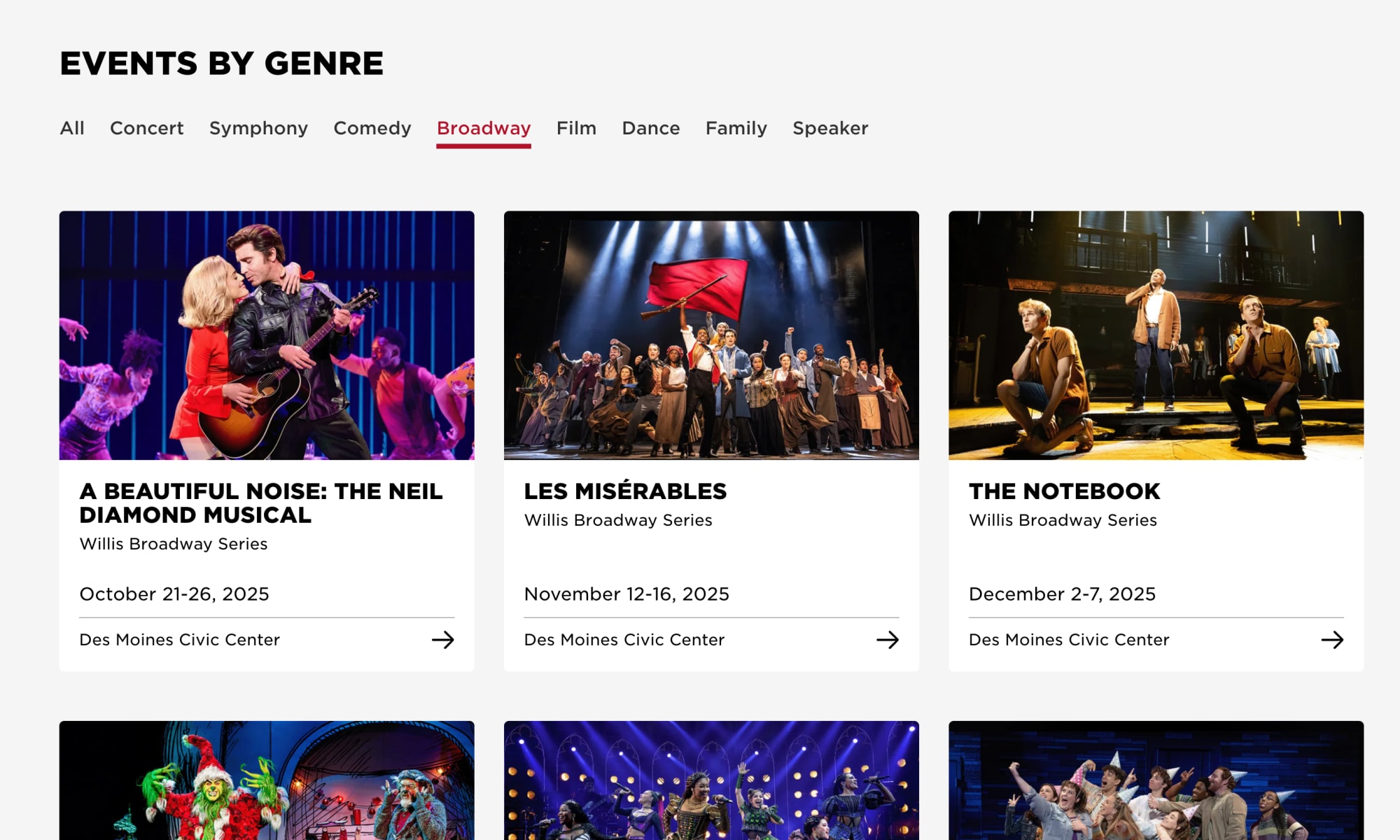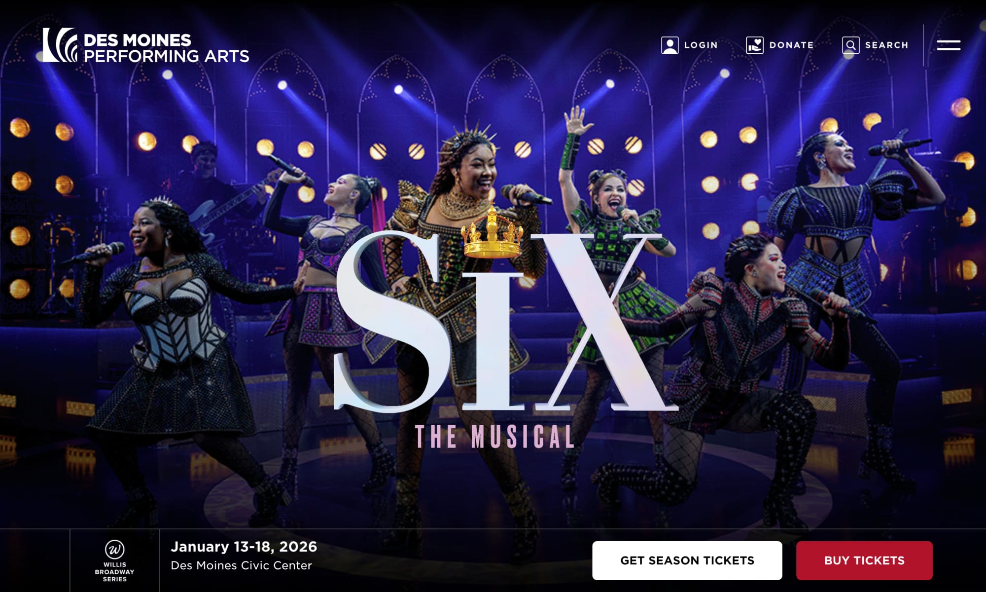 Die Willis Broadway Series der DMPA bringt jährlich 10-12 Gastspiele nach Des Moines und wird von einem großen Abonnentenstamm unterstützt. Die traditionellen Pakete mit festen Sitzplätzen umfassen 6 Produktionen mit längeren Laufzeiten, mit der Option, zum Zeitpunkt des Kaufs Shows mit begrenztem Engagement hinzuzufügen. Das Marketingteam wollte den Kauf von Zusatzvorstellungen durch ein einfaches, visuell ansprechendes Upsell-Erlebnis innerhalb des Abonnement-Kaufpfades steigern.