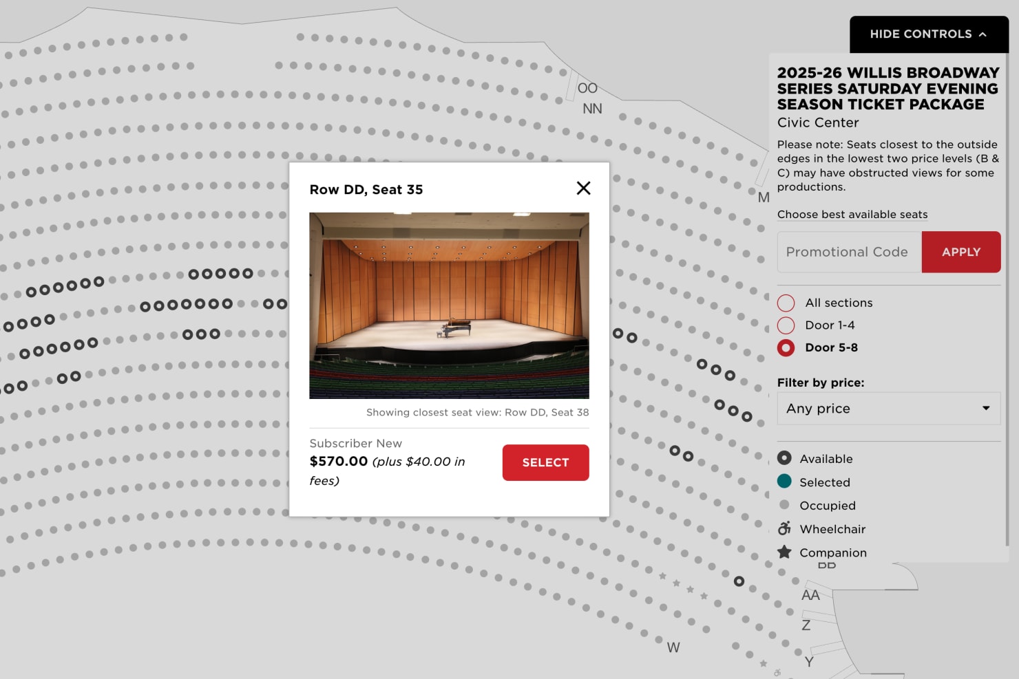 - Select Your Own Seat — via SeatCurve, our accessible, mobile-responsive SYOS application with view-from-seat previews