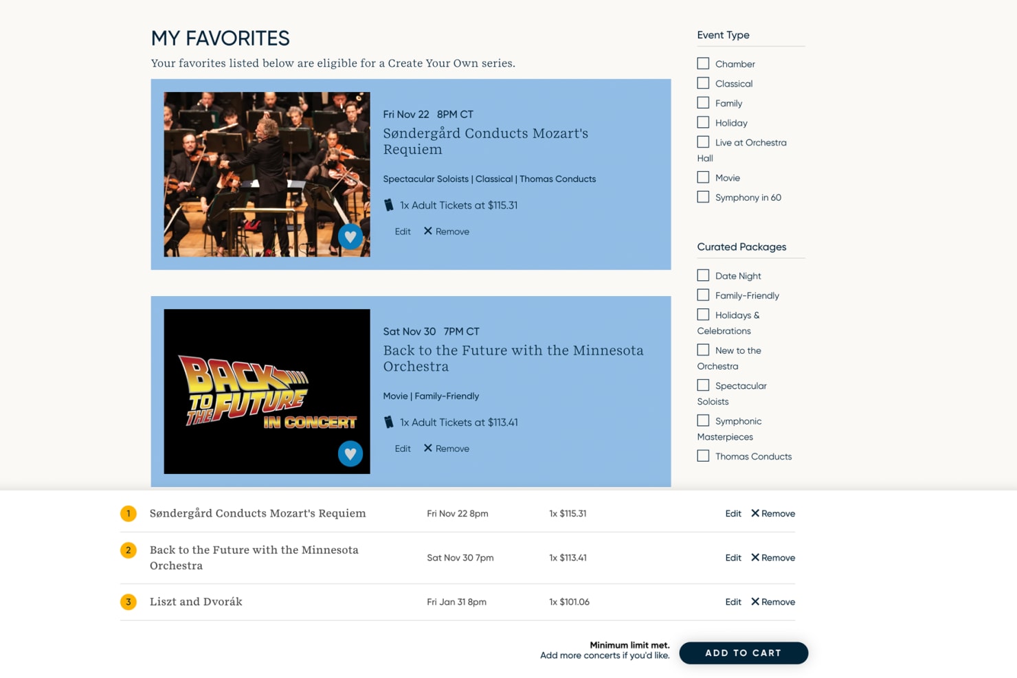 Our Tessitura integration work extends well beyond the purchase path. We build website features that pull from and push to Tessitura across the full range of its API:
